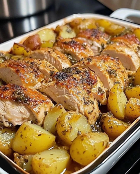 - Drizzle with remaining 1 tbsp olive oil. Bake for another 25–30 minutes, or until chicken is cooked through and potatoes are golden.