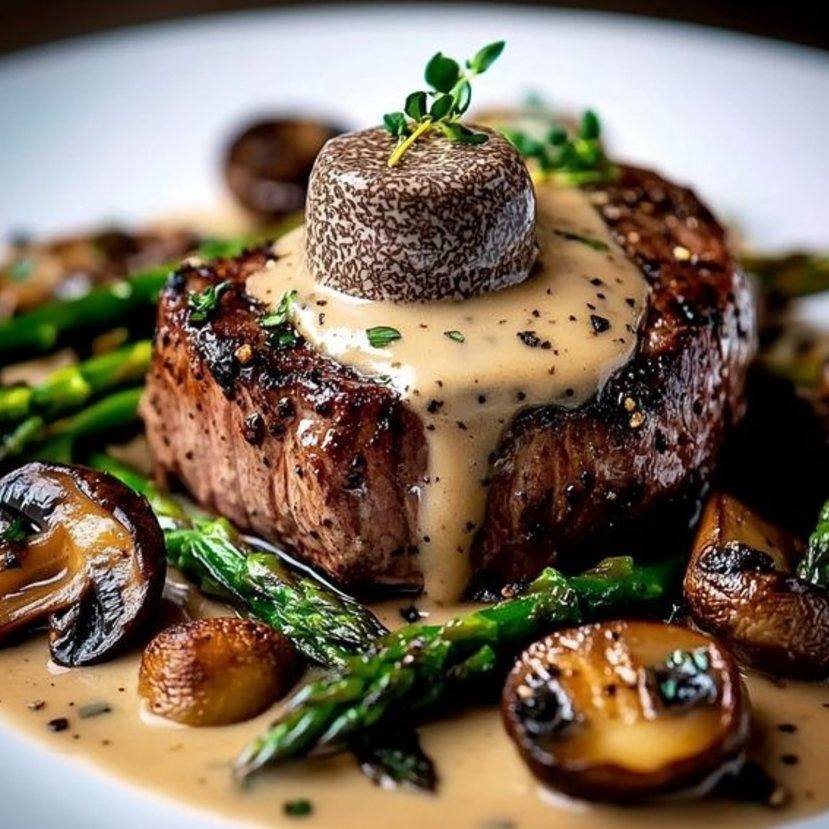 Enjoy your perfectly cooked Filet Mignon with Mushroom Sauce and Asparagus! The rich, creamy mushroom sauce complements the tender filet, while the asparagus adds a crisp, flavorful contrast. This is a truly indulgent and elegant meal.