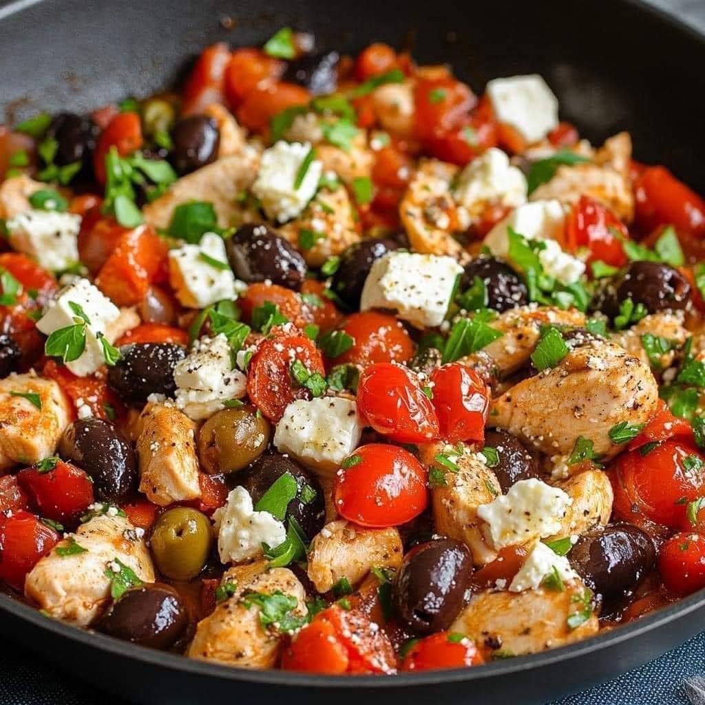 - Return the cooked chicken to the skillet, and stir everything together. Sprinkle with crumbled feta cheese and cook for another 2 minutes, just until the cheese starts to warm.