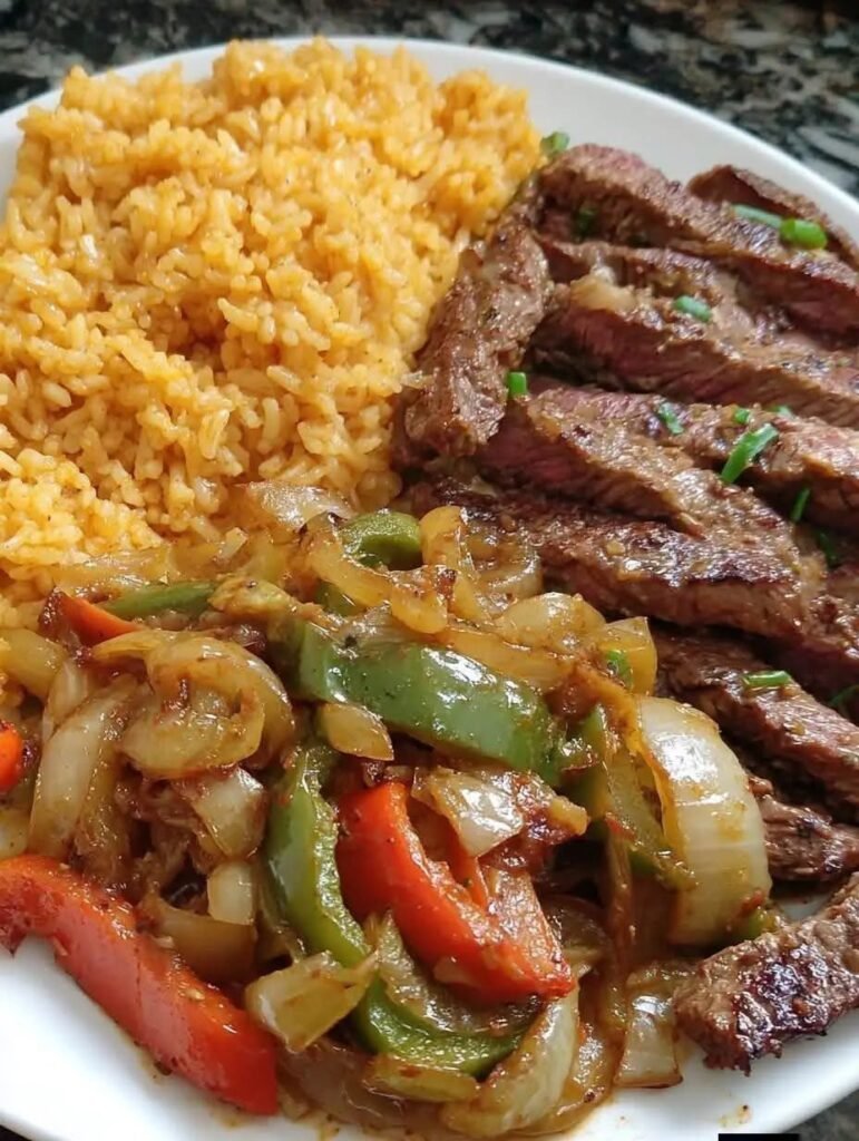 🥩🫑🧅🍚 Steak with Peppers, Onions, and Yellow Rice