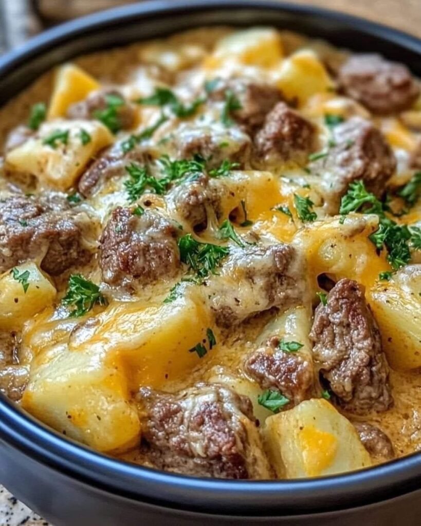 This casserole embodies the essence of comfort food—hearty, cheesy, and satisfying. Its slow-cooked nature ensures the steak and potatoes are infused with the robust flavors of cheddar and seasonings, making every bite a delight. Whether you’re cooking for family or prepping a meal for the week, this recipe is a reliable choice that delivers every time.